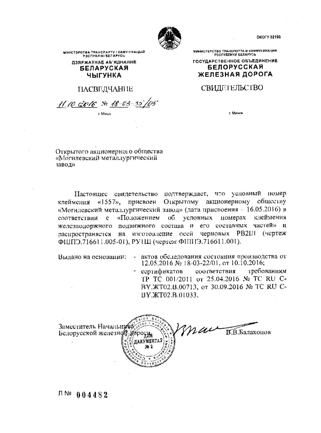 Свидетельство условный номер РУ1Ш, РВ2Ш