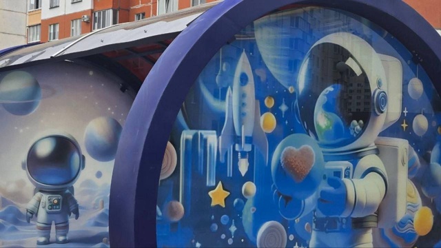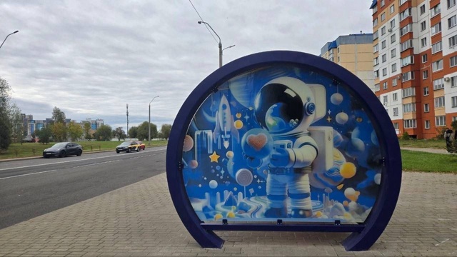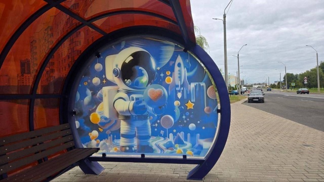 В Могилеве продолжается тренд на тематические остановки - в этот раз космическим оформлением обзавёлся остановочный павильон по улице Пысина. На нем горожане ждут общественный транспорт "в компании" двух симпатичных космонавтов.