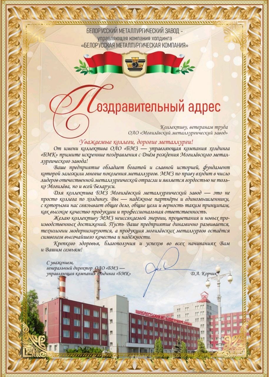 Желаю коллективу ММЗ неиссякаемой энергии, процветания и новых производственных достижений. Пусть Ваше предприятие динамично развивается, технологии модернизируются, а продукция могилевских металлургов остаётся символов высочайшего качества и надёжности.
