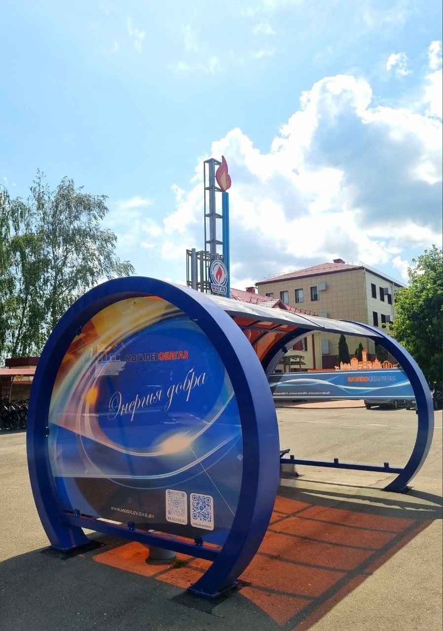 Обратили внимание на брендированный остановочный павильон, на котором работники РУП «Могилевоблгаз» ожидают транспорт.